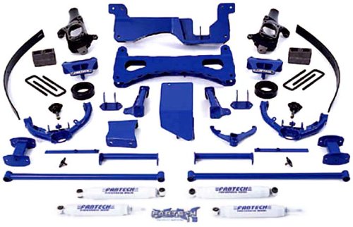 The 8" system has more lift and super trick upper tubular control arms than the 6" system. Designed for 2001 GMC K2500/3500 heavy duty trucks. The new upper control arms feature integrated multiple shock mounting tabs should you desire the optional dual shock system, for the ultimate in dampening capabilities. Rear lift is accomplished via a 4" block and add a leaf system with rear bump stop brackets.