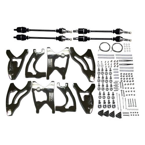 SuperATV 8 Inch (4 Inch Per Side) Billet Long Travel Lift Kit With Heim Joints And Axles For Polaris RZR ***Billet Aluminum A Arms ***Polished then Beautifully Chromed ***Even the Hardware has Been Chromed!!! ***Sharpest kit on the market!!! ***Finally an Affordable Billet Aluminum Long Travel Kit - Upgrade Your RZR to Dramatically Improve the Handling and Capability with the Best Looking Long Travel Kit on the Market - Complete 4" (per side) long travel kit for the Polaris RZR (8" Total). - This kit includes all the items you need to install including: ***4 New Heavy Duty Rhino Axles (1 year warranty) ***Heavy Duty Racing Heim Joints for full Adjustability ***Extended Brake Lines with Clips ***8 Billet Aluminum A Arms, Machined underneath to reduce weight, polished and chromed ***Tie Rod Extensions with Heim Joints ***All Necessary Hardware and Installation Instructions - We have not left out any detail on the exceptional long travel kit, it has high quality heim joints for maximum adjustability, adjustable billet aluminum shock mounts, all the hardware etc.